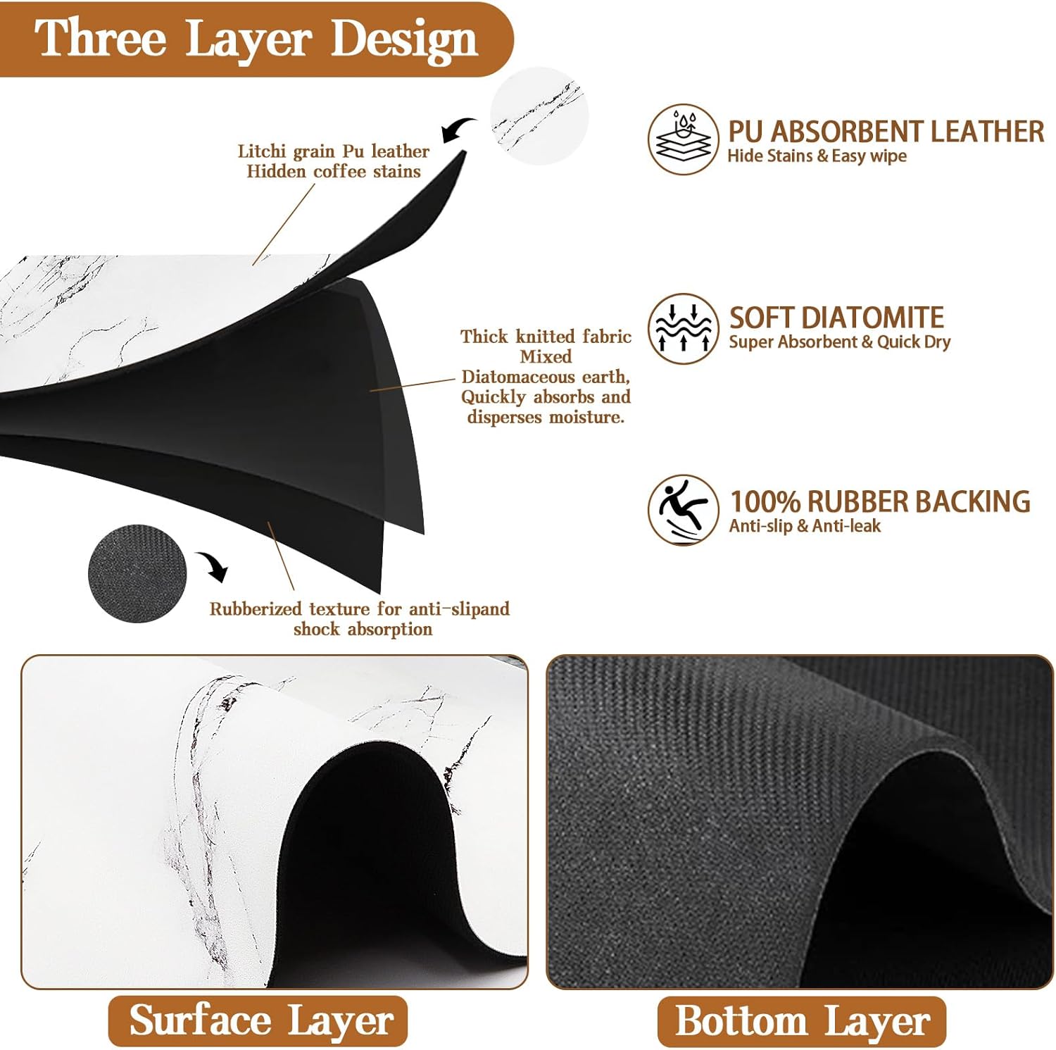 • 【Slip-Proof & Durable】The coffee mat features a sturdy non-slip rubber base that ensures stability on any surface, even when wet. Put household items on the 3 tier kitchen quick dry mat, and the non-slip bottom will be adsorbed on the table to prevent them from moving. Paired with its sophisticated marble-patterned surface, it not only reduces the risk of accidents in your kitchen but also adds a touch of elegance to your kitchen decor.