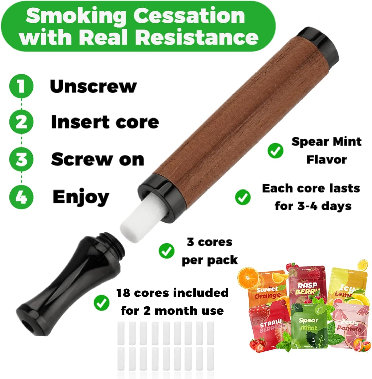 | Included Components | Flavored Air Device, 18 Refillable Cores (3 per flavor: Mint, Lemon, Pomelo, Orange, Strawberry, Raspberry) |