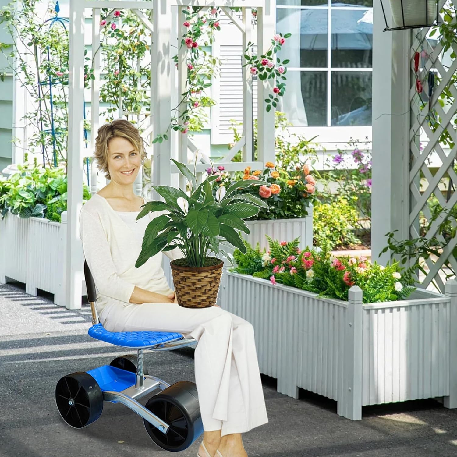Description: The garden seat with wheels glides smoothly around the garden, offers 360-degree rotation, a foldable backrest and a breathable seat to reduce pressure on your back and knees. The Rolling Garden Seat can be adjusted from 9.06-13.78 inches in height, allowing you to work at different heights without feeling overwhelmed. The sturdy frame and wheels ensure stable and smooth movement on various terrains, from lawns to paths. A convenient storage basket under the seat keeps your gardening essentials close at hand. It provides ample space for tools, gloves and small pots, keeping everything organized and within reach. Features:. Garden Seat with Wheels. -Color: Blue+Black. -Material: Galvanized pipe, pp. -Size:. Length: 47 cm/18.50 inch. Width: 31 cm/12.20 inch. Height: 23-35 cm/9.06-13.78 inch. Note: Manual measurement, please allow slight errors on size. The colors may exist slight difference due to different screens. Package Including 1 * Garden Seat with Wheels